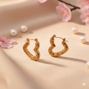 0 out of 5₹499Original price was: ₹499.₹299Current price is: ₹299.Trendy heart-shaped hoop earrings crafted in stainless steel with a glossy gold finish and hammered texture—durable, lightweight, and perfect for everyday or party wear.